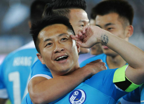 4月15日,大連人隊球員閻相闖在比賽中慶祝進球。新華社記者 龍雷 攝