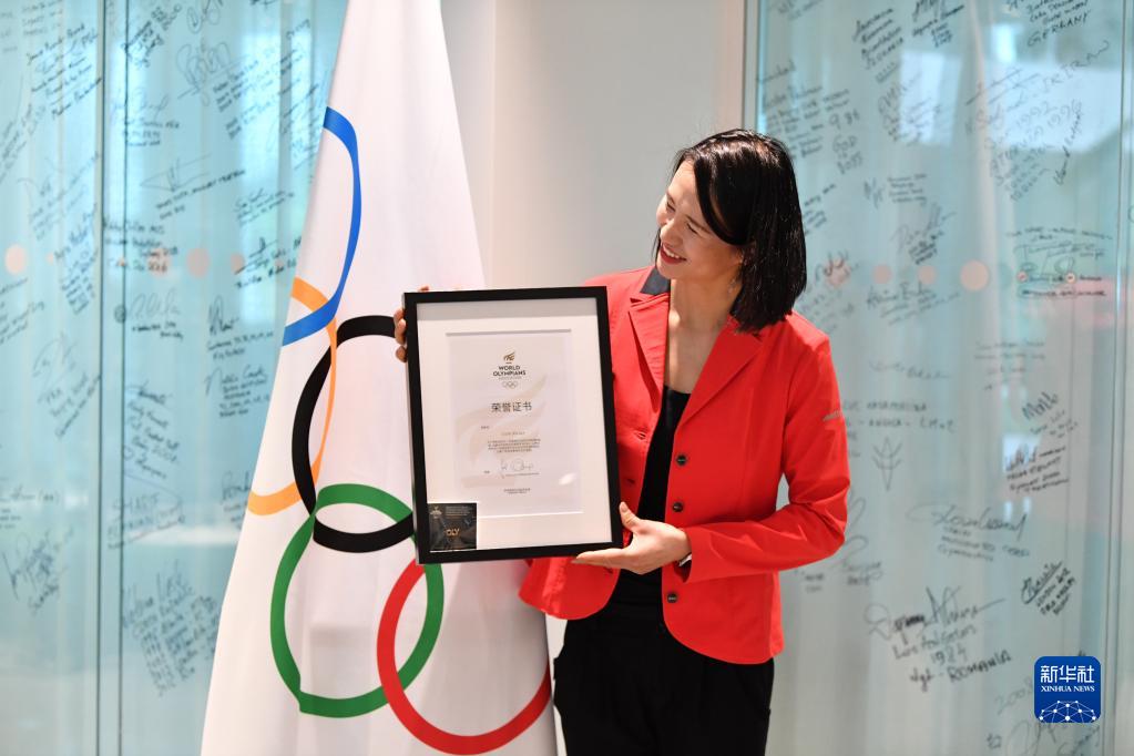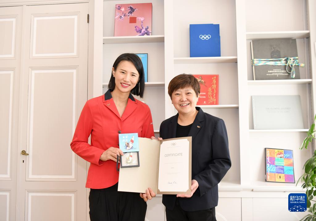 5月10日,在位于瑞士洛桑的國際奧委會總部,倫敦奧運(yùn)會帆船金牌得主徐莉佳獲贈OLY徽章和證書。新華社記者 連漪 攝