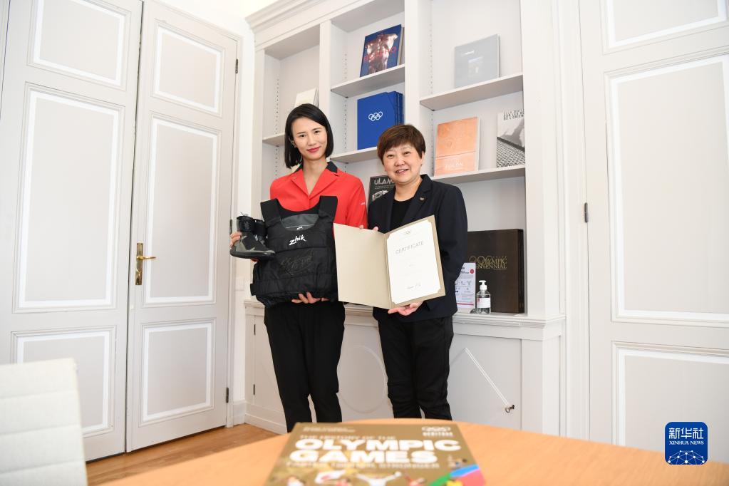 5月10日,在瑞士洛桑,倫敦奧運(yùn)會帆船金牌得主徐莉佳(左)將當(dāng)年穿的比賽服和比賽鞋,以及她的英文自傳《GOLDEN LILY》贈送給奧林匹克博物館后獲得證書。新華社記者 連漪 攝