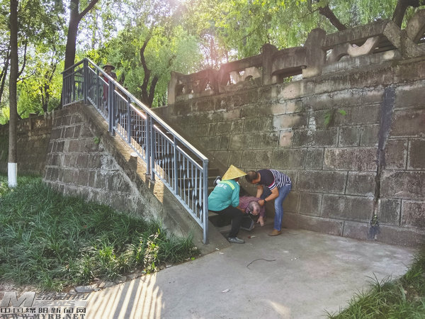 5月18日17時20分左右,清運車司機劉后剛、嚴榮禮和綠化工人楊樹坤正在河堤清掃清運斷枝枯葉,突然一位市民急切地朝向他們大喊:“有個老人在石階上摔倒了,需要幫助。”聽到求助聲,三人立即丟下手中工具,迅速奔了過去。剛跑到石階處,他們就看見一老人倒在石階上,劉后剛喊了一聲“搞快”,就沖到老人身邊。確定老人意識清醒后,劉后剛和楊樹坤一左一右攙扶起老人(如圖)。劉后剛用老人的手機聯(lián)系上其家屬,幾分鐘后,老人家屬急匆匆地趕到了現(xiàn)場,對三位好心人表示感謝。確定老人身體無大礙后,劉后剛和同事才返回工作崗位。