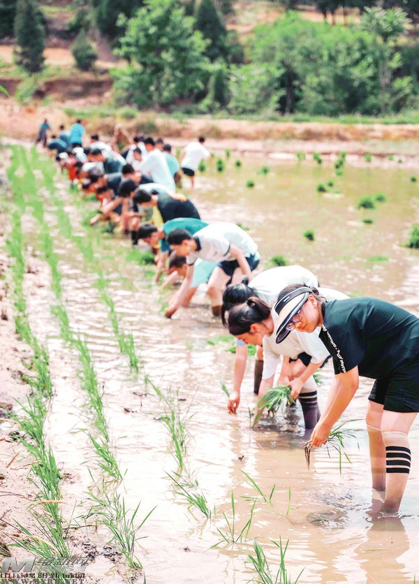活動中,孩子們來到農耕研學小院換上“裝備”,迫不及待地沖進魚塘里,和活蹦亂跳的魚兒“戰(zhàn)”成一團。來到插秧環(huán)節(jié),孩子們卷起褲管、光著腳丫踏進了農田,在志愿者的指導下,整齊劃一地插起秧苗來,不一會兒就插了好幾排秧苗(如圖)。