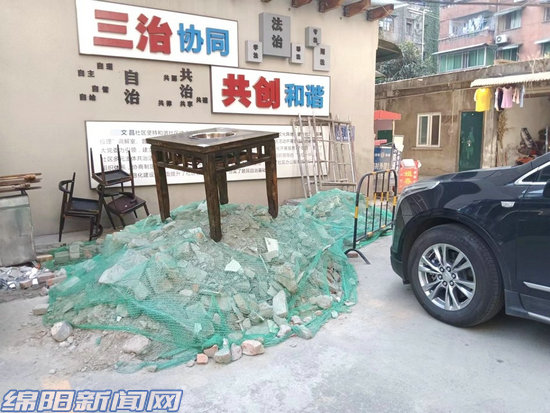 走進紅星街98號院大門,在文昌社區(qū)“三治協(xié)同、共創(chuàng)和諧”的宣傳牌下,堆放著一堆建筑垃圾,垃圾堆上還放有其他雜物,十分扎眼。在靠近居民樓的一側(cè),地面幾乎全部被挖爛,一幅“千瘡百孔”的模樣,居民樓的另一側(cè),也堆放著一堆建筑垃圾。一排汽車前的路面也全部被挖爛,塵土飛揚,整個院內(nèi)凌亂不堪。