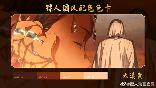 從畫(huà)面來(lái)看,制作團(tuán)隊(duì)為動(dòng)畫(huà)特意設(shè)計(jì)的殘陽(yáng)紅、大漠黃、刀鋒墨、墨染朱等六套專屬色卡,被廣大動(dòng)畫(huà)迷們所喜愛(ài),一如網(wǎng)友評(píng)價(jià)提及的那樣“中式復(fù)古的紅、幽靜深沉的藍(lán)還有體現(xiàn)了大漠風(fēng)情的配色,在審美這點(diǎn)上,《鏢人》真的絕了”。大膽啟用的高飽和度色調(diào)更是凸顯了團(tuán)隊(duì)在畫(huà)面構(gòu)建及色彩應(yīng)用上力求品質(zhì)與極致的雙重加持。
