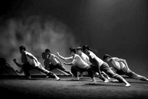 作為舞蹈劇場(chǎng),《凝》的呈現(xiàn)非常先鋒,給人最大的震撼是它沒(méi)有明確的劇情發(fā)展線。大幕開啟后,十幾位舞者在舞臺(tái)上站立,用一串不斷重復(fù)、節(jié)奏逐漸變化的馬步開啟演出,在前十分鐘左右的時(shí)間里,表演幾乎沒(méi)有背景音樂(lè),間或兩聲鼓聲,抑或是梆子聲,讓舞者變化了節(jié)奏。忽然,舞者向前出拳,展現(xiàn)出快、準(zhǔn)、狠的勁道與爆發(fā)力,呼吸聲與拳風(fēng)都在耳邊。就這樣,《凝》進(jìn)入了武術(shù)與舞蹈交融的世界,或呈現(xiàn)爆發(fā)力,或展現(xiàn)生動(dòng)多姿的招式,或大開大合地舒展動(dòng)作,將蔡李佛拳、白鶴拳、洪拳三大派別的武術(shù)招式意象化地展現(xiàn)。