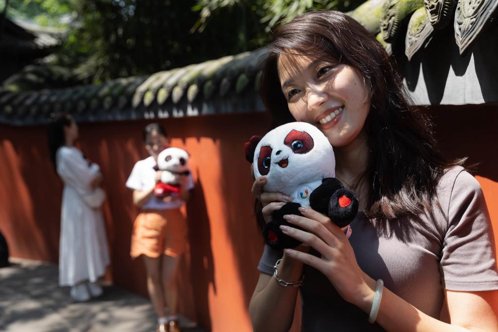 7月19日,游客手捧成都大運會吉祥物“蓉寶”在杜甫草堂的紅墻邊留影。新華社記者 江宏景 攝