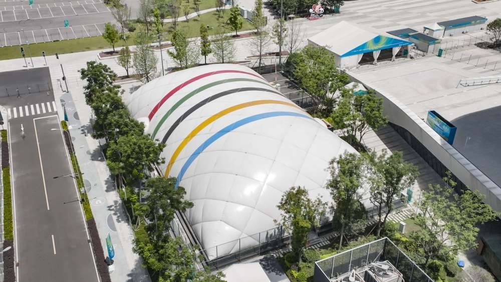 這是7月22日在成都高新體育中心多功能館外拍攝的臨時(shí)訓(xùn)練氣膜館(無人機(jī)照片)。該臨時(shí)訓(xùn)練氣膜館采用輕型裝配式氣膜結(jié)構(gòu),利用氣壓來支撐,無需任何梁、柱,可得到更大的完全凈空的建筑空間,具有節(jié)約能源、減少水資源消耗、降低二氧化碳排放量、延長使用壽命、降低建筑物運(yùn)行成本、促進(jìn)可持續(xù)發(fā)展等優(yōu)點(diǎn)。新華社發(fā)