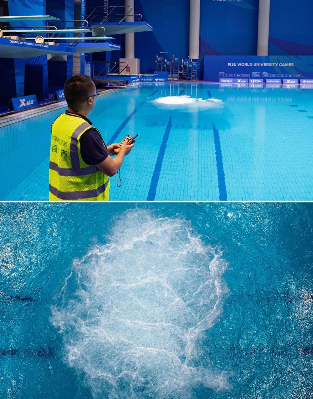 這是一張拼版照片。上圖為:7月22日,在簡陽文體中心游泳館,中國華西四川機(jī)司東來印象(簡陽文體中心)項(xiàng)目工作人員正在操作池底安全氣墊系統(tǒng)。下圖為:池底安全氣墊系統(tǒng)效果展示。該系統(tǒng)為確保跳水運(yùn)動(dòng)員安全,在氣體釋放時(shí)形成上升水流和側(cè)向水流增加水體的柔軟度和彈性,減緩人體在水中的降落速度,防止對運(yùn)動(dòng)員身體的傷害。新華社記者 江宏景 攝