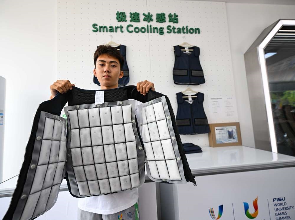 7月15日,在大運(yùn)村科技服務(wù)工作站,工作人員在展示降溫冰背心。新華社記者 王曦 攝