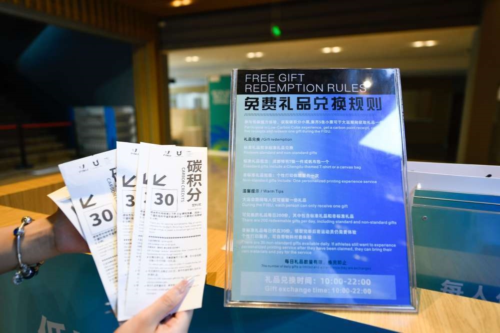 7月16日,在大運(yùn)村藝術(shù)中心內(nèi),工作人員展示“低碳魔方”兌換的“碳積分”小票。新華社記者 胥冰潔 攝