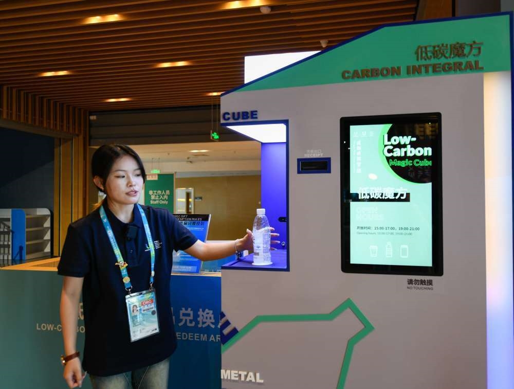 7月16日,在大運(yùn)村藝術(shù)中心內(nèi),工作人員展示如何使用“低碳魔方”。將喝完的礦泉水瓶廢棄品投入“低碳魔方”可獲得“碳積分”小票,憑小票可兌換相應(yīng)的大運(yùn)會(huì)禮品。新華社記者 胥冰潔 攝