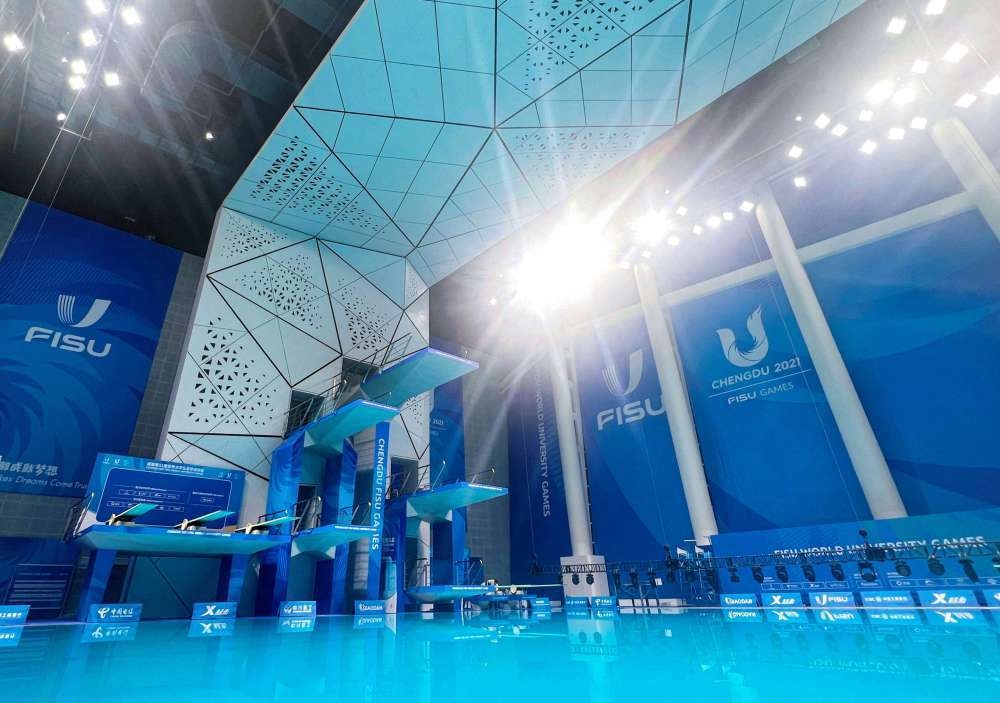 7月22日拍攝的簡陽文體中心游泳館跳水臺(tái),它是我國唯一一座多折面異型清水混凝土跳臺(tái),經(jīng)久耐用且節(jié)約資源。簡陽文體中心游泳館是成都大運(yùn)會(huì)跳水項(xiàng)目的比賽場館。新華社記者 江宏景 攝