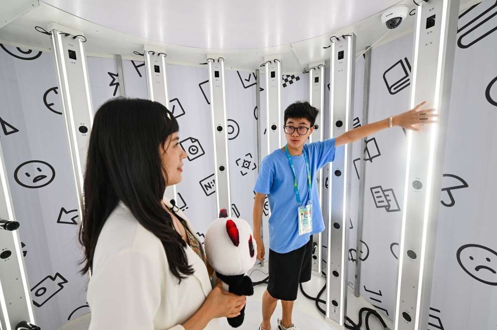 7月15日,在大運(yùn)村科技服務(wù)工作站,參觀者在工作人員引導(dǎo)下體驗(yàn)3D攝影。新華社記者 王曦 攝