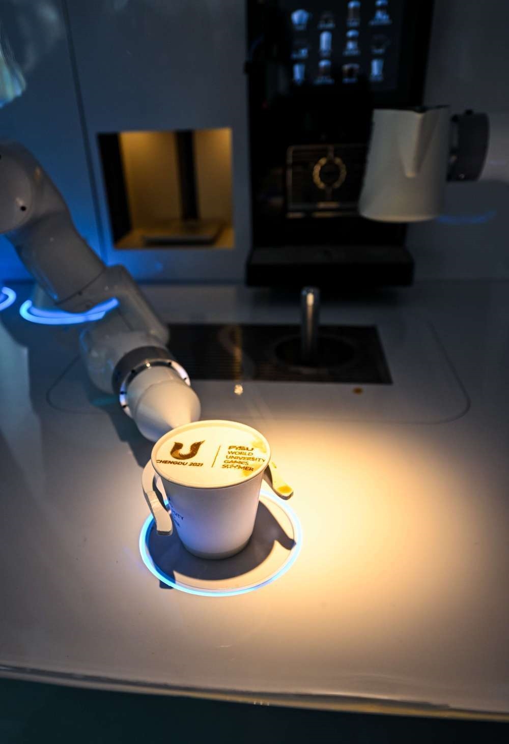 這是7月15日在大運(yùn)村智能咖啡驛站拍攝的自動(dòng)制作的咖啡。新華社記者 王曦 攝