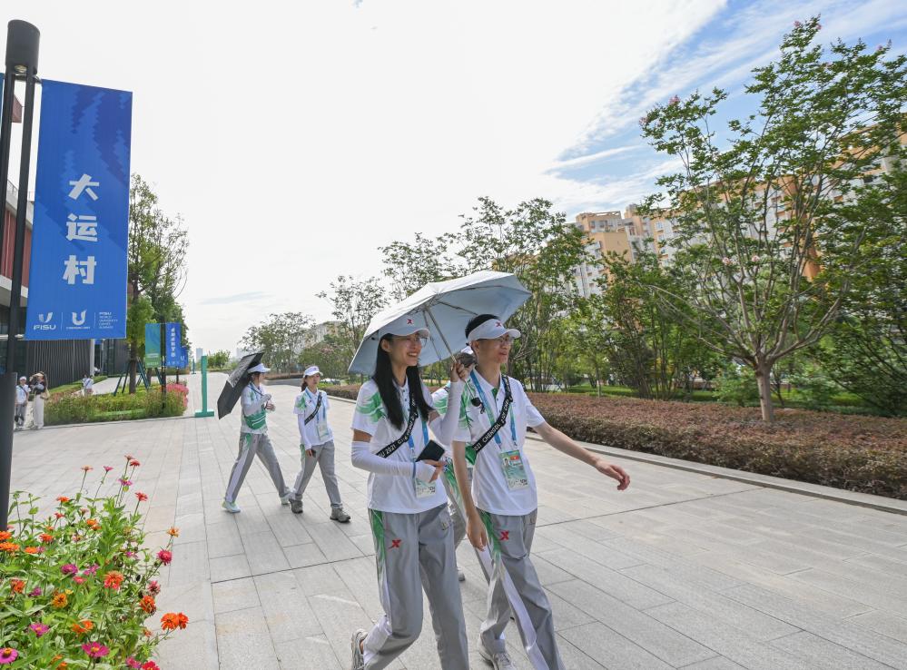 下了飛機,就有志愿者舉著牌子迎接,然后帶路到機場外的大巴,大運村外的下車點緊挨著安檢口,過了安檢便是一排等候多時的白色電車,運動員們幾乎不需要走動就能直達(dá)公寓和場館。更讓人倍感舒適的,是一路上的志愿者們的微笑。