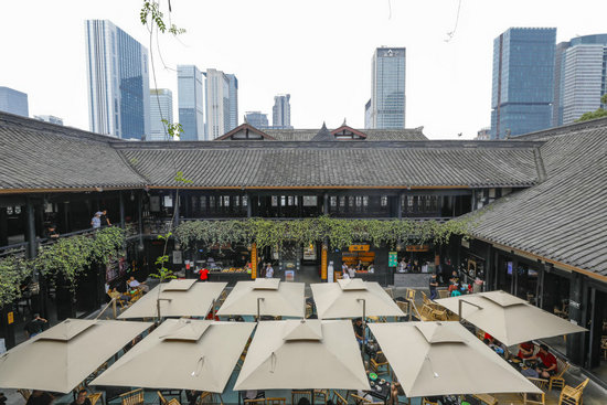 人們在成都太古里大慈寺內(nèi)的茶社喝茶、休閑,不遠(yuǎn)處高樓林立