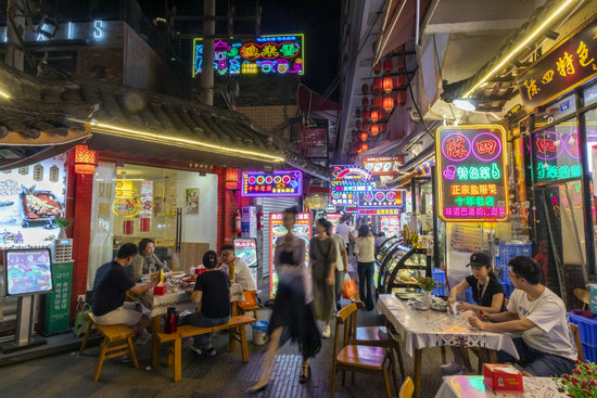 人們在成都猛追灣街道望平社區(qū)的美食一條街“香香巷”里逛街、尋找美食