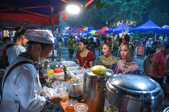7月1日,游客在貴州“村超”足球賽場附近設置的免費攤位購買地方特色小吃。新華社記者 楊文斌 攝