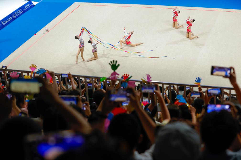 7月30日,成都大運(yùn)會藝術(shù)體操項(xiàng)目集體全能進(jìn)行決賽第二輪。新華社記者 沈伯韓 攝