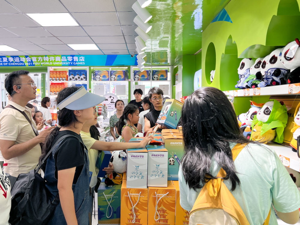 據(jù)成都大運(yùn)會(huì)官方特許商品零售店紅星路店店長(zhǎng)胡杰介紹,自6月下旬開(kāi)業(yè)以來(lái),店里便一直處于忙碌的狀態(tài)。“我們?cè)缟?點(diǎn)營(yíng)業(yè)到晚上12點(diǎn),門(mén)口經(jīng)常有約百人在排隊(duì),很多消費(fèi)者在我們開(kāi)店之前就排在門(mén)口,拿著圖片問(wèn)哪些有貨、能買(mǎi)到哪些。”胡杰表示,店里目前每天接待顧客約3萬(wàn)人次,日均銷售額在40-50萬(wàn)元之間。