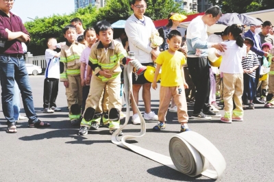 參觀過程中,消防車兩側(cè)的器材箱收獲了小朋友們最多的驚呼:“消防車好像魔法口袋,什么都有!”消防宣講員逐一介紹車輛、車載個人防護裝備的名稱、性能和用途等,同時結(jié)合校園、家庭消防安全要點,用通俗易懂的語言講解消防安全知識以及逃生自救知識。面對各種消防救援作戰(zhàn)服,小朋友們個個躍躍欲試,在消防員的指導(dǎo)下,小朋友們穿上滅火救援服、戴上消防頭盔,登上云梯車、坐上救援車,變身“小小消防員”。
