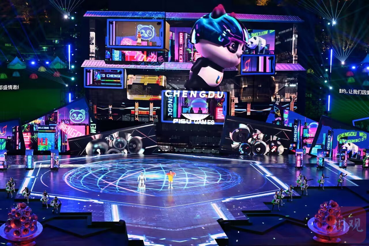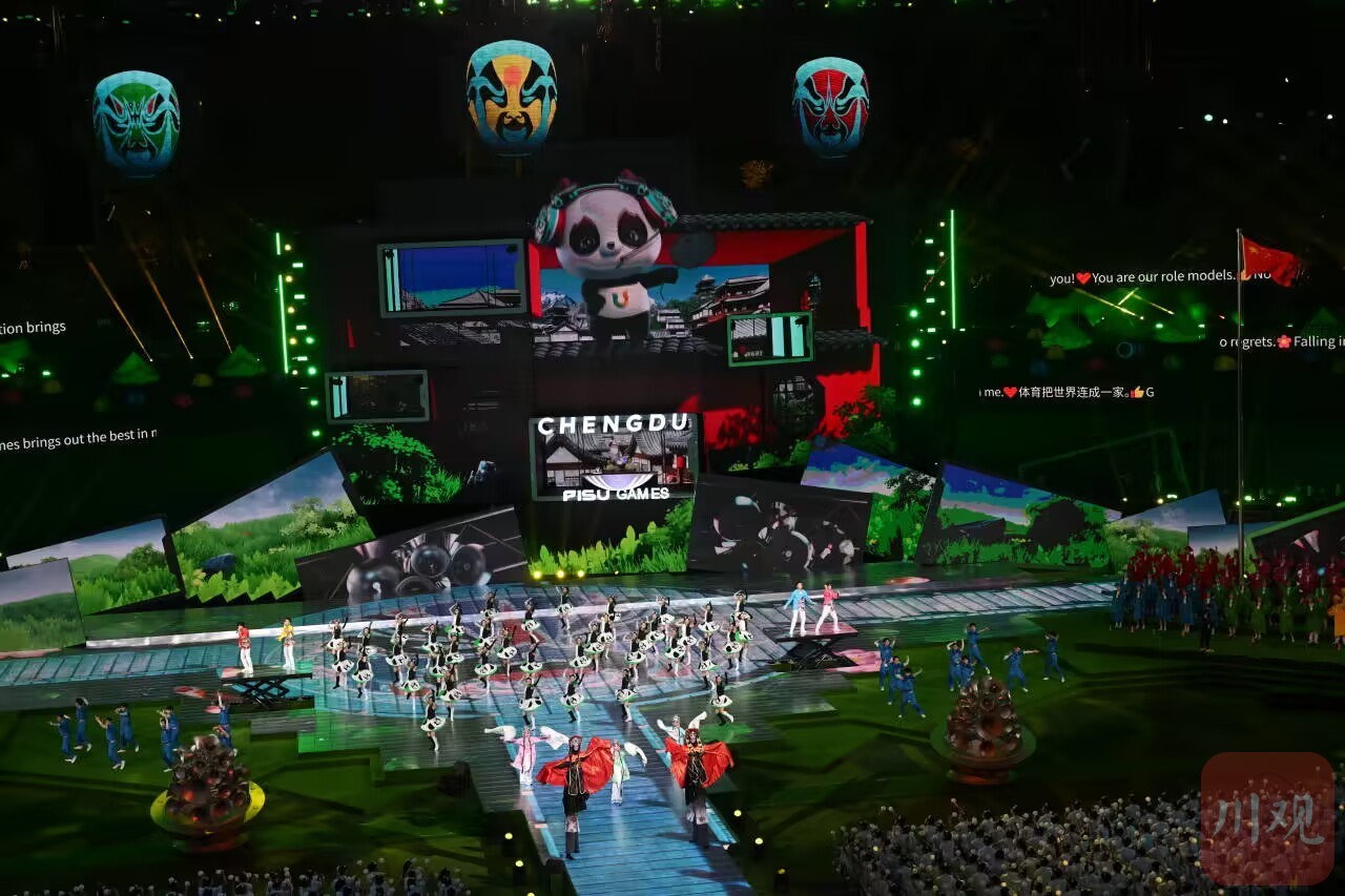 據了解,閉幕式倒計時以“成都現在時”為主題,由場景影像、現場表演、焰火三個部分構成。隨著焰火在空中完成倒計時數字呈現,太陽神鳥展翅映出光芒,現場燃起煙花,照亮夜空。