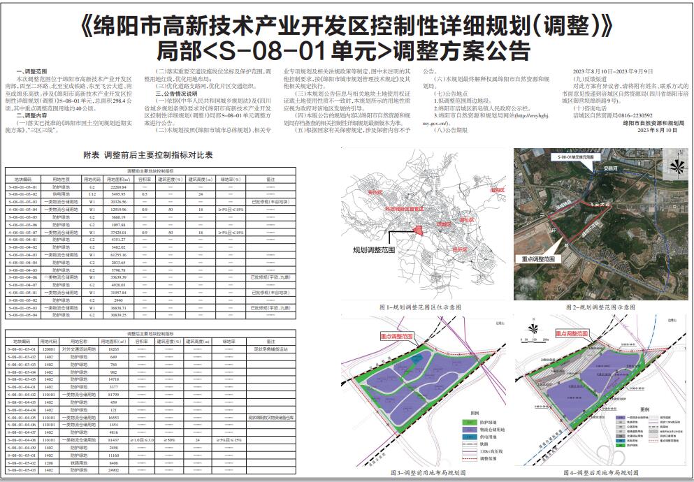 《綿陽市高新技術(shù)產(chǎn)業(yè)開發(fā)區(qū)控制性詳細規(guī)劃(調(diào)整)》 局部(S-08-01單元)調(diào)整方案公告