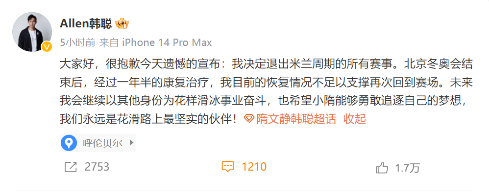 “大家好,很抱歉今天遺憾地宣布:我決定退出米蘭周期的所有賽事。北京冬奧會結束后,經(jīng)過一年半的康復治療,我目前的恢復情況不足以支撐再次回到賽場。未來我會繼續(xù)以其他身份為花樣滑冰事業(yè)奮斗,也希望小隋能夠勇敢追逐自己的夢想,我們永遠是花滑路上最堅實的伙伴!”韓聰寫道。