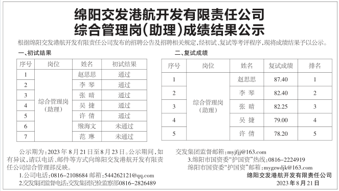綿陽(yáng)交發(fā)港航開(kāi)發(fā)有限責(zé)任公司 綜合管理崗(助理)成績(jī)結(jié)果公示