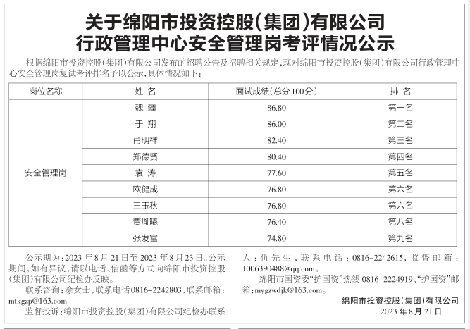 關(guān)于綿陽市投資控股(集團(tuán))有限公司行政管理中心安全管理崗考評情況公示