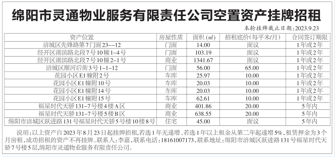 綿陽市靈通物業(yè)服務(wù)有限責任公司空置資產(chǎn)掛牌招租