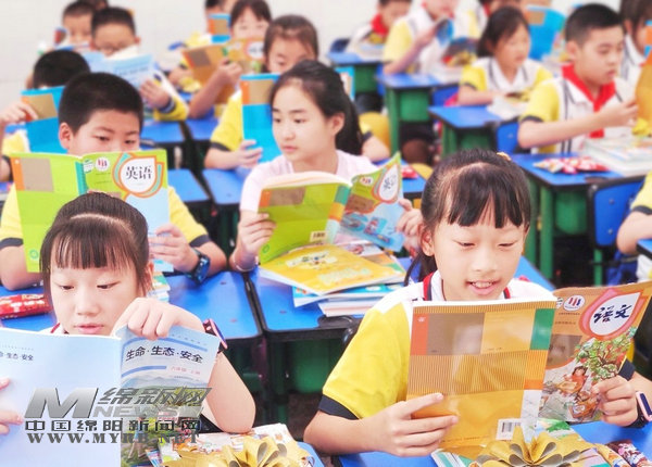 8月31日上午9點,綿陽市小學(xué)新學(xué)期入學(xué)報到開始。這是南街小學(xué)六年級小學(xué)生走進(jìn)新教室,迫不及待地翻看新書。