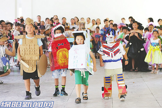 綿陽新聞網(wǎng)訊 近日,一場“環(huán)保時(shí)裝秀”在綿陽市南街小學(xué)習(xí)藝坊拉開帷幕,百余名學(xué)生在老師和家長的協(xié)助下,發(fā)揮想象,用靈巧的雙手對(duì)塑料袋、紙殼、舊報(bào)紙、舊衣物等廢舊物品進(jìn)行分類設(shè)計(jì),改造成一件件獨(dú)具匠心的“時(shí)裝”,走出了一場別開生面的時(shí)尚大秀(如圖)。