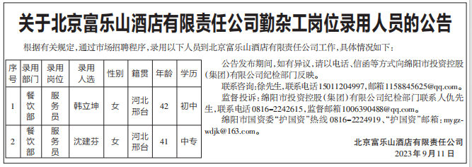 關(guān)于北京富樂山酒店有限責(zé)任公司勤雜工崗位錄用人員的公告