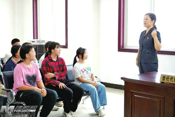 為了讓同學們了解法院工作,蘆溪法庭主動邀請同學走進法庭參觀。同學們體驗了安檢流程,參觀了訴訟服務大廳、家事審判庭、科技法庭、溫馨調(diào)解室等區(qū)域,了解了法庭工作日常、訴訟服務中心設(shè)施功能、立案流程以及相關(guān)便民服務舉措等,實地感受到“智慧法院”的“智慧”和法律的莊嚴。法官還向同學們講解了法官、書記員、原告、被告等席位和職責以及法槌、法徽的象征意義。在對審判工作有了更加直觀的了解后,同學們有序“換裝”,坐到不同席位上,沉浸式融入“法官”“書記員”等角色,通過體驗開庭中的各個環(huán)節(jié),進一步增加了對法律的敬畏感。