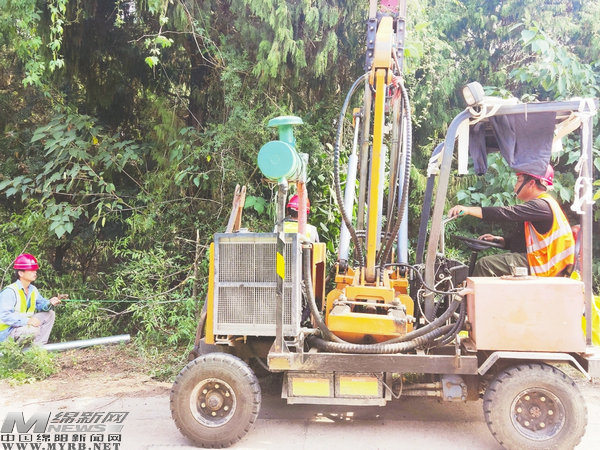 在小枧鎮(zhèn)玉龍村,工人們正在安裝公路防護欄