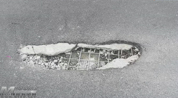 記者走近一看,坑里面的鋼筋已經(jīng)裸露出來,現(xiàn)場初步測量,坑洞深度約5-10厘米不等??优杂兴嘈迯吐访娴暮圹E,但不知為何這個坑沒有徹底修復好。