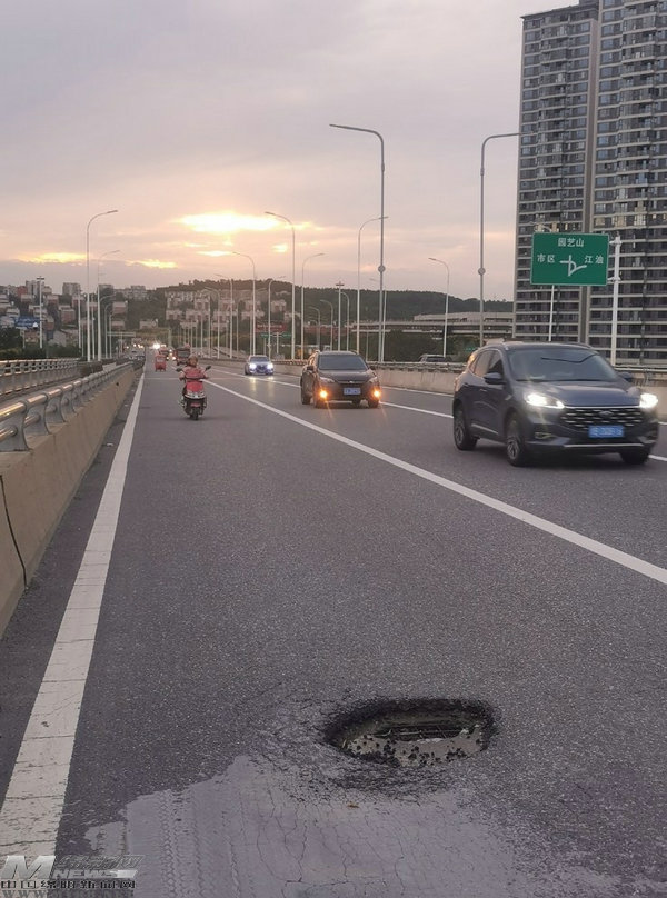 “你看,這個地方是上橋方向,車輛都在加速,開到面前才發(fā)現(xiàn)這個大坑,很多司機慌忙并線避讓,由于橋面上是實線,不能輕易變道,這就帶來一連串的安全隱患。”謝師傅說。