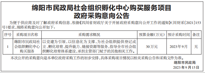綿陽(yáng)市民政局社會(huì)組織孵化中心購(gòu)買服務(wù)項(xiàng)目政府采購(gòu)意向公告
