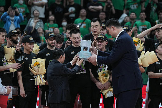 5月15日,時任遼寧本鋼隊主教練楊鳴在頒獎儀式上接過總冠軍獎杯。新華社記者 潘昱龍 攝