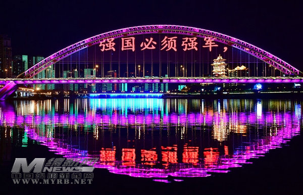 關(guān)心國防、民無兵不安、強(qiáng)國必須強(qiáng)軍……9月21日,記者在綿陽三江湖國家級濕地公園看到,一組組國防教育內(nèi)容的大型字幕在富樂大橋的顯示屏上循環(huán)播放,倡導(dǎo)市民學(xué)習(xí)國防知識和兵役知識,接受愛國主義和國防教育,在三江兩岸璀璨的燈光中,顯得更加耀眼奪目。