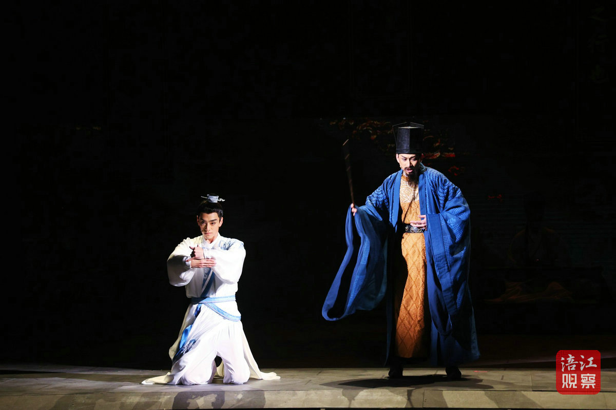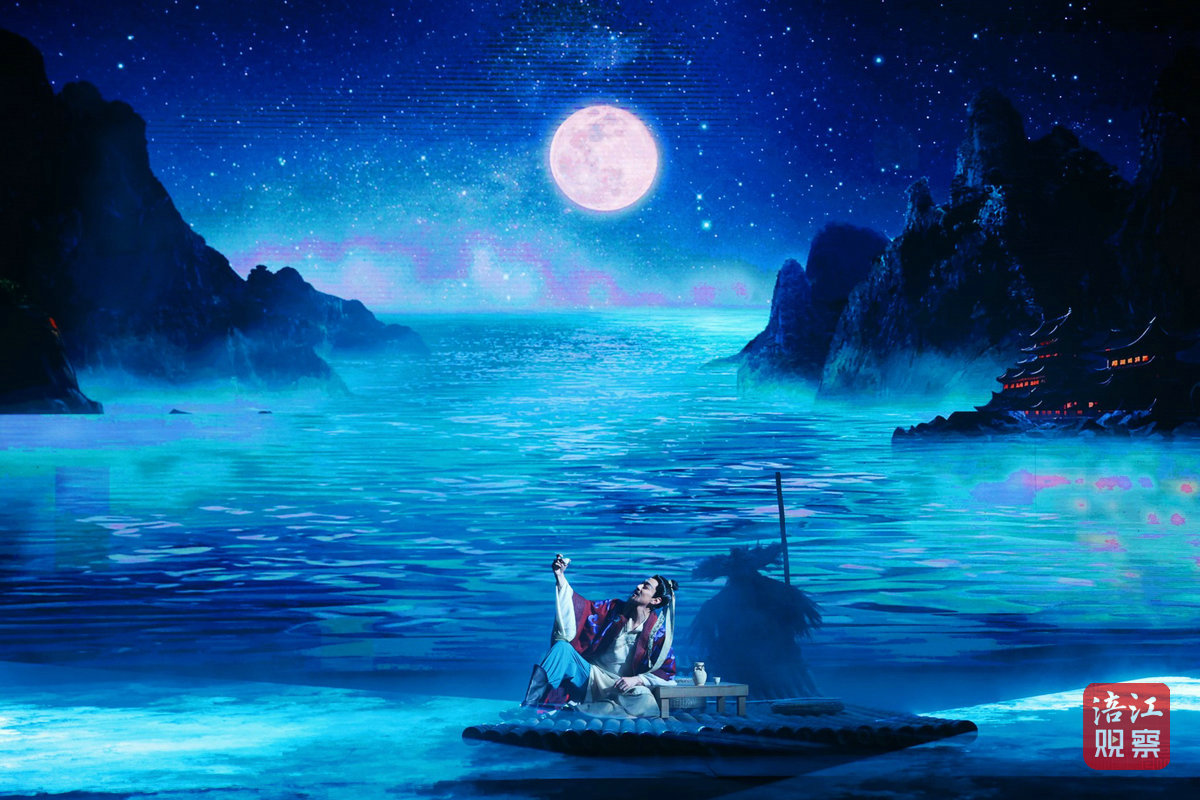 當(dāng)天19時(shí)30分,李白的人生故事隨著音樂(lè)聲啟幕。在四川綿陽(yáng)的江油青蓮鎮(zhèn),李白在家鄉(xiāng)的自然山水間盡情釋放才情,恣意表達(dá)自己放蕩不羈的生活方式。在親人和朋友的支持、鼓勵(lì)下,他為國(guó)辭鄉(xiāng)出蜀,最終成為一代“詩(shī)仙”。