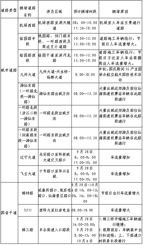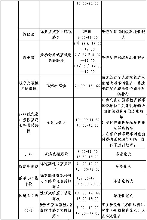 預計群眾自駕出行數(shù)量將增加,市內(nèi)以“鄉(xiāng)村游”“近郊游”“親子游”為主,綿梓路、綿興路、綿三路交通流量整體較大。
