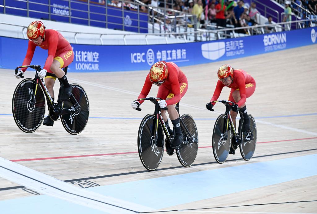 女子團體競速賽第一輪,中國隊以46秒900刷新亞運會紀錄。男子團體競速賽第一輪,中國隊以43秒211刷新亞運會紀錄。