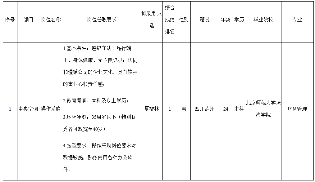 根據(jù)四川長(zhǎng)虹空調(diào)有限公司發(fā)布的招聘公告及招聘相關(guān)規(guī)定,經(jīng)面試、考察、體檢等程序,擬錄用夏福林到長(zhǎng)虹空調(diào)工作,現(xiàn)予以公示,具體情況如下: