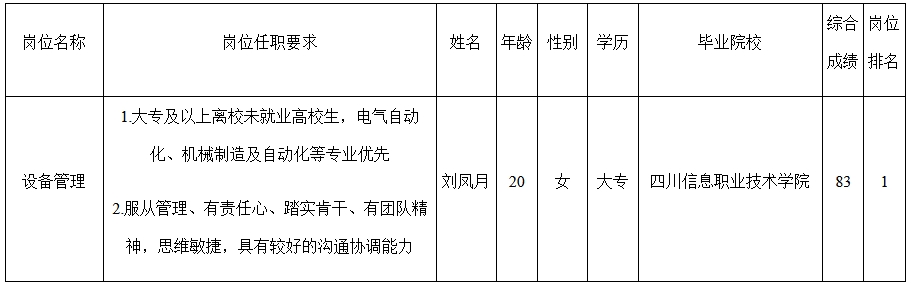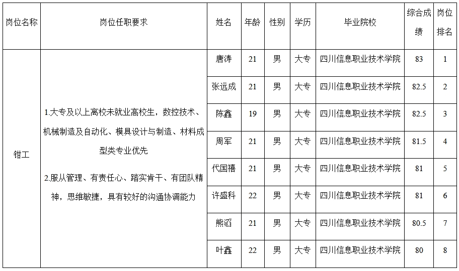 根據(jù)四川長虹技佳精工有限公司發(fā)布的招聘公告及招聘相關(guān)規(guī)定,經(jīng)資格審查、面試等程序,現(xiàn)將測試合格人員予以公示。