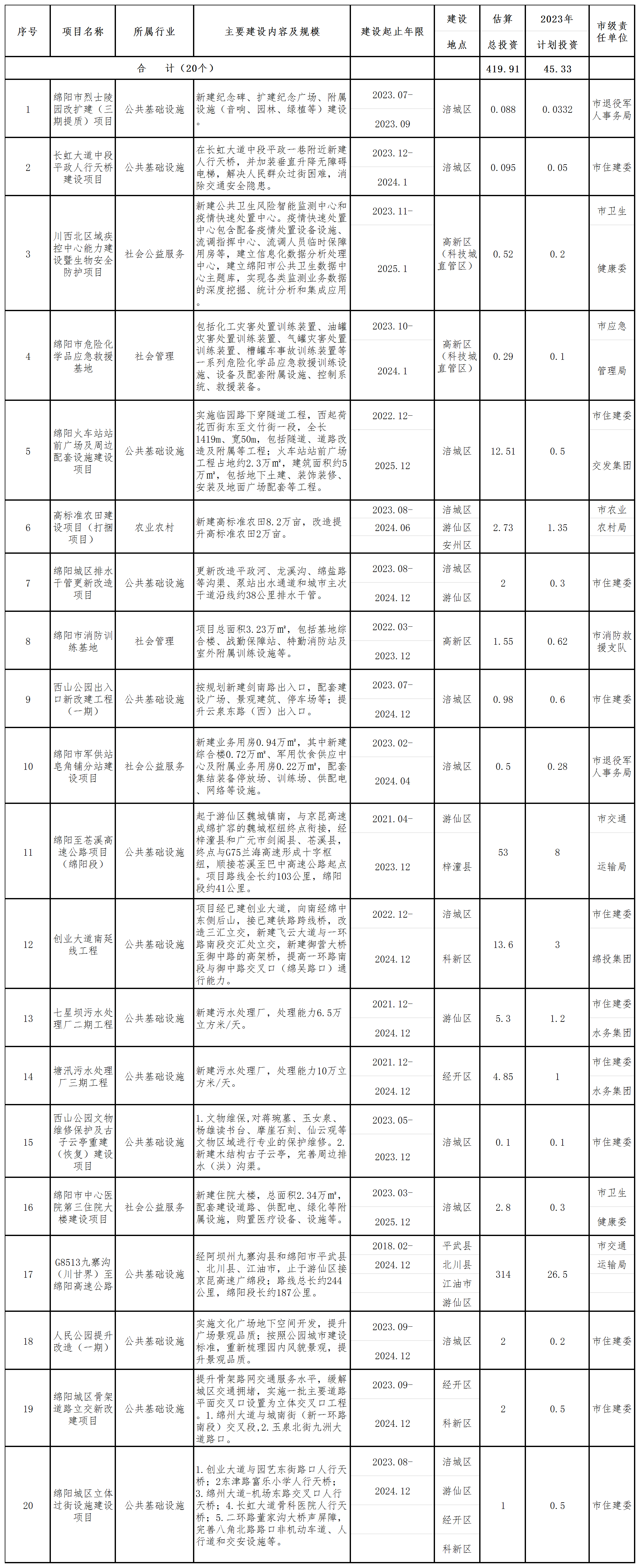 2023年12月27日,綿陽市八屆人大常委會第二十次會議審議并通過了《綿陽市人民政府關(guān)于2023年度市本級政府投資項(xiàng)目計(jì)劃調(diào)整方案的報(bào)告》,2023年市本級政府投資項(xiàng)目共20個(gè),計(jì)劃總投資419.91億元,年度計(jì)劃投資45.33億元。