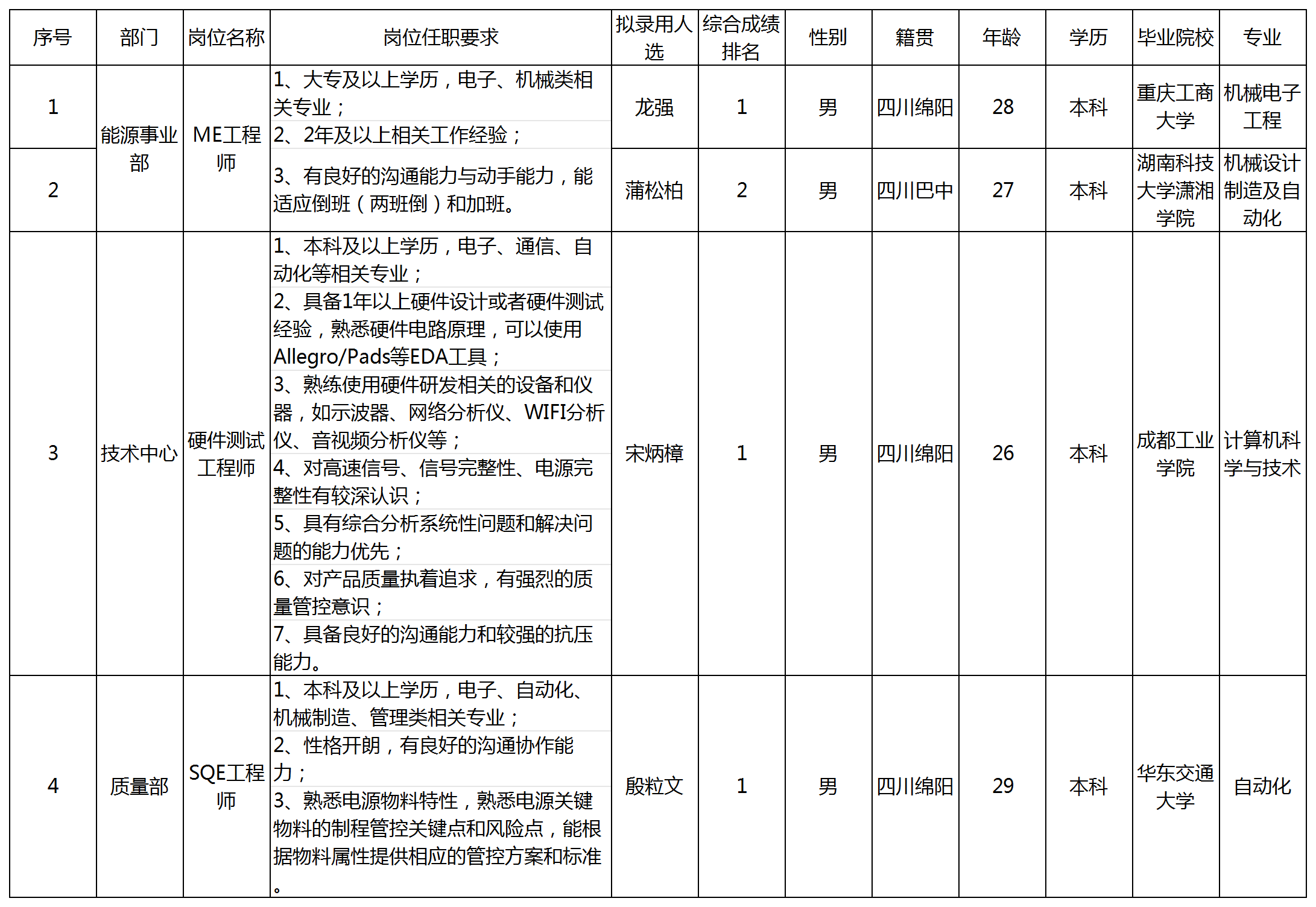 根據(jù)四川九州電子科技股份有限公司發(fā)布的招聘公告及招聘相關(guān)規(guī)定,經(jīng)筆試、面試、考察、體檢等程序,擬錄用龍強等4名同志到四川九州電子科技股份有限公司工作,現(xiàn)予以公示,具體情況如下: