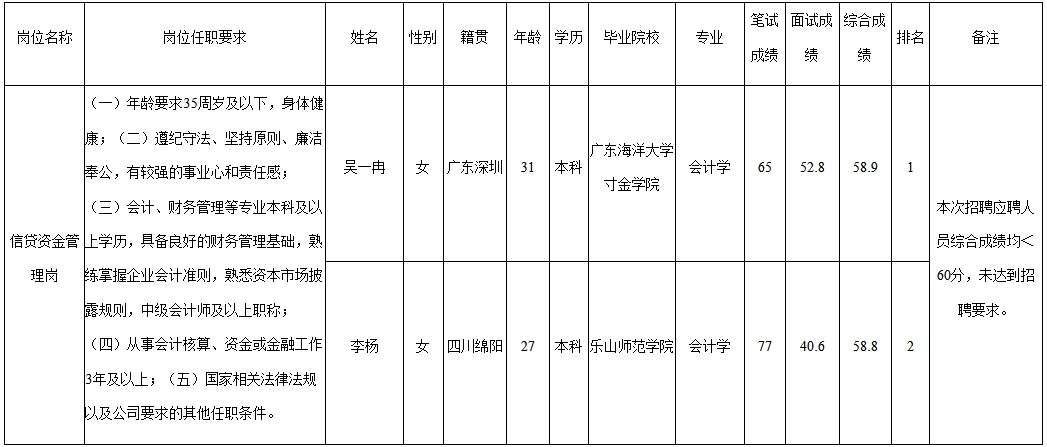 根據(jù)四川嘉來建筑工程有限公司發(fā)布的招聘公告及招聘相關(guān)規(guī)定,經(jīng)筆試、面試等程序,現(xiàn)將筆試、面試成績予以公示。