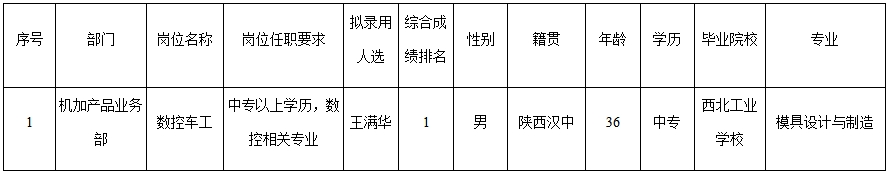 根據(jù)零八一電子集團(tuán)有限公司發(fā)布的招聘公告及招聘相關(guān)規(guī)定,經(jīng)筆試、面試、考察、體檢等程序,擬錄用王滿華同志到機(jī)加產(chǎn)品業(yè)務(wù)部工作,現(xiàn)予以公示,具體情況如下: