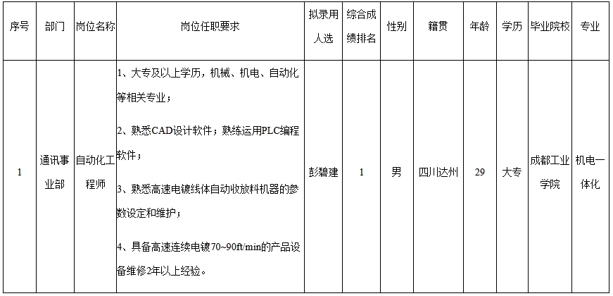 根據(jù)四川華豐科技股份公司發(fā)布的招聘公告及招聘相關(guān)規(guī)定,經(jīng)筆試、面試、考察、體檢等程序,擬錄用蔣旭聰?shù)韧镜剿拇ㄈA豐科技股份有限公司工作,現(xiàn)予以公示,具體情況如下:
